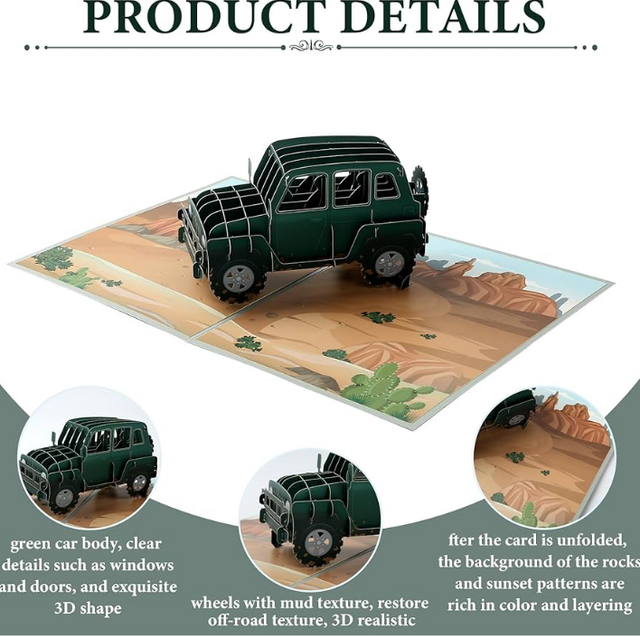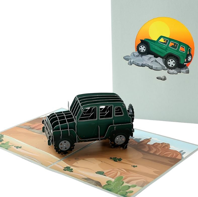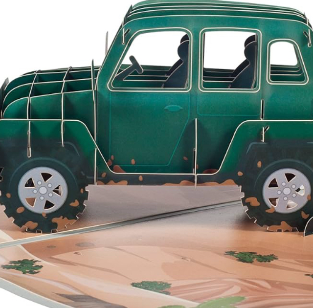 This car birthday card pops up to reveal a realistic green off-road vehicle with incredible tire and body details, perfect for car enthusiasts.