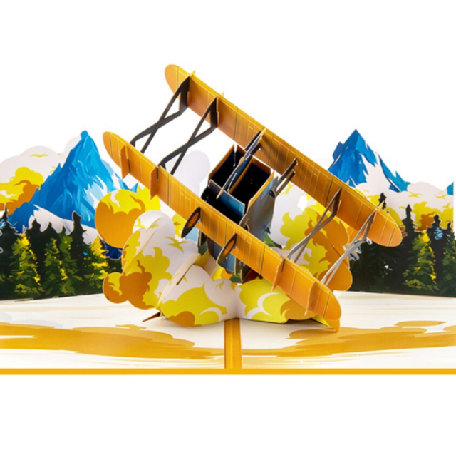 Take to the skies with this 3D pop-up card featuring a vintage biplane flying above a majestic mountain range. The scene unfolds with trees, clouds, and rugged peaks, creating a sense of motion and adventure. The biplane is intricately crafted in bold yellow tones, giving it a nostalgic and uplifting feel. Measuring 15 x 20 cm, the card includes a white envelope (16 x 21 cm) and a blank insert (8.5 x 13 cm) for your personal message. Whether for birthdays, retirements, or encouragement, this card is perfect for anyone who dreams of flight or loves the spirit of exploration. Its layered paper engineering and scenic backdrop make it a keepsake worth displaying. Ideal for aviation enthusiasts and fans of vintage design.