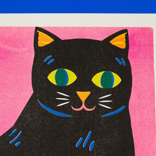Risograph print featuring a black cat, printed in the using soy based environmentally friendly inks on recycled paper stock Risograph prints can vary from print to print in terms of colour depth and texture, this makes each one unique!