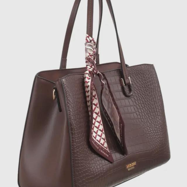 Features: Chocolate Tote Bag | Scarf | Fully Lined Interior | Detachable Strap | Zip Closure | Double Handles