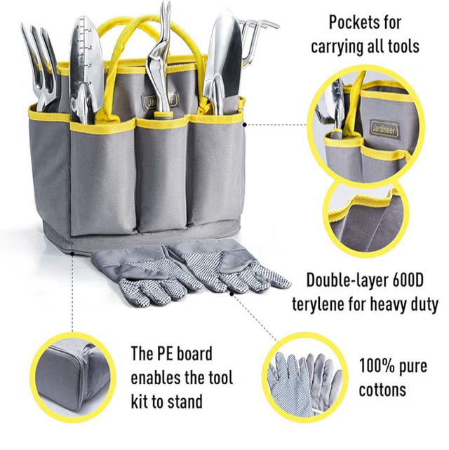 - HEAVY DUTY GARDEN TOOL SET – 8Pcs garden tool set includes pruning shears, hand trowel, transplanter, weeder, cultivator, hand rake, gardening gloves and tote bag. Ideal gardening gifts.
