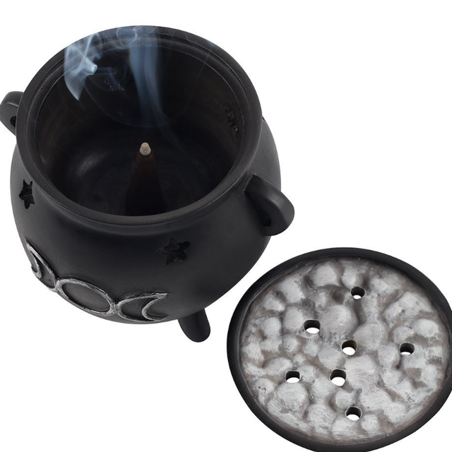 Place an incense cone inside of this resin triple moon cauldron burner and watch the smoke gently rise from the top. Accented by cutout stars and a distressed silver-effect triple moon design, with a removable 'bubbling' brew top.