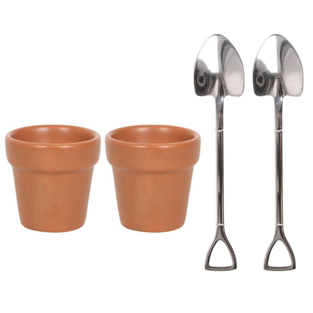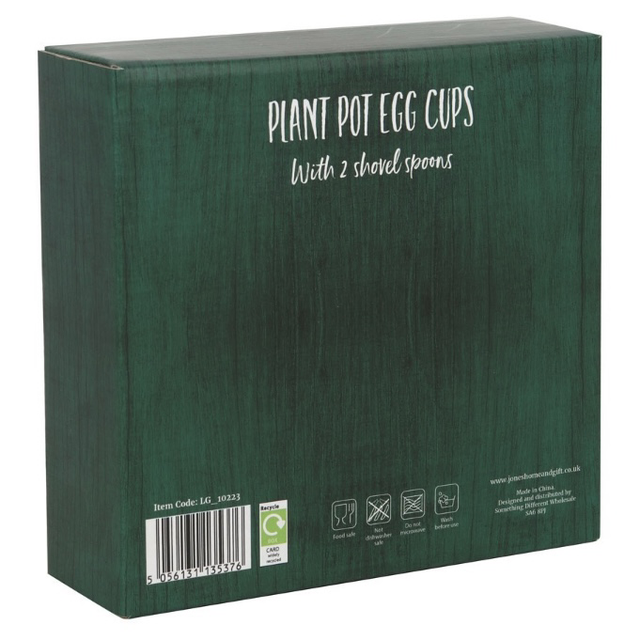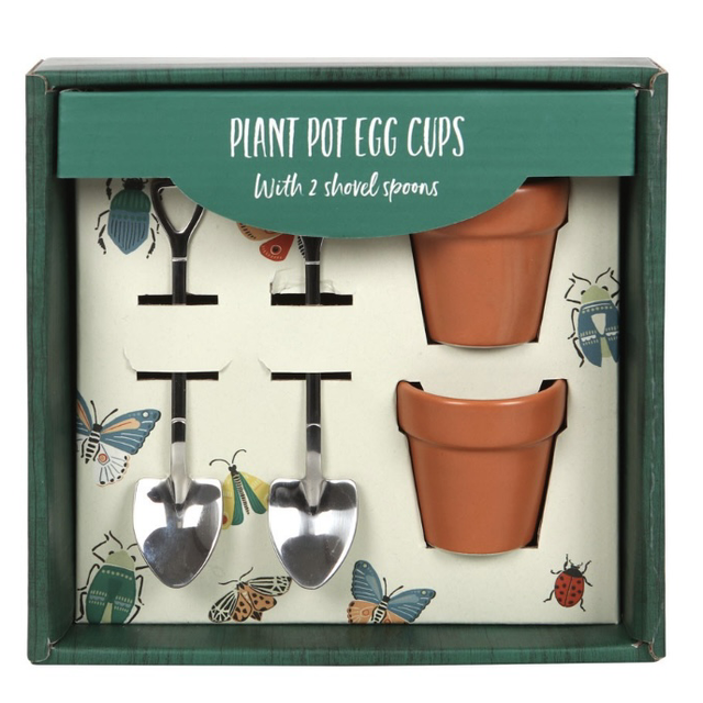 This pair of adorable egg cups comes shaped like mini plant pots and is sure to complete any breakfast table spread. With matching shovel spoons, this unique egg cup set will quickly become a kitchen favourite. Do not microwave. Dishwasher safe.
